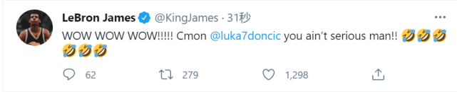 值得一提的是,已经随湖人队返回洛杉矶的勒布朗-詹姆斯也看着这场比赛,已经36岁的老詹也抑制不住激动,他发推@了东契奇,跟他开玩笑说:“哇哇哇,天呐,东契奇,你是认真的吗,这球你懵进的吧?”