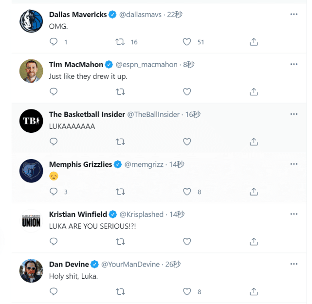 东契奇这个神奇的绝杀命中后,美媒在社交媒体上疯狂刷屏,独行侠官推发了一堆乱码抑制不住自己的兴奋,而灰熊官推则发了一个表情表达不爽的心情。此外,众多记者和媒体也在推特上感叹东契奇这一记神奇的绝杀进球。