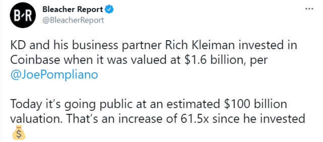来源:24直播网04-15 16:2824直播网4月15日讯北京时间4月15日,据美媒Bleacher Report报道,篮网球星凯文-杜兰特和他的商业合作伙伴里奇-克莱曼之前投资了一家名为Coinbase的数字货币交易平台,当时这一平台的市值是16亿美元,而如今,这家公司以1000亿美元的估值完成上市,杜兰特因此从这笔投资中获得61.5倍的回报。