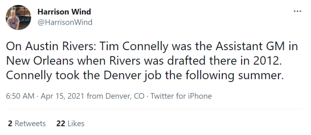 值得一提的是小里弗斯被新奥尔良选中时,现任掘金篮球运营总裁蒂姆-康奈利是鹈鹕(当时叫黄蜂)的副总经理。他在2013年夏天离开新奥尔良,接手了掘金的工作。