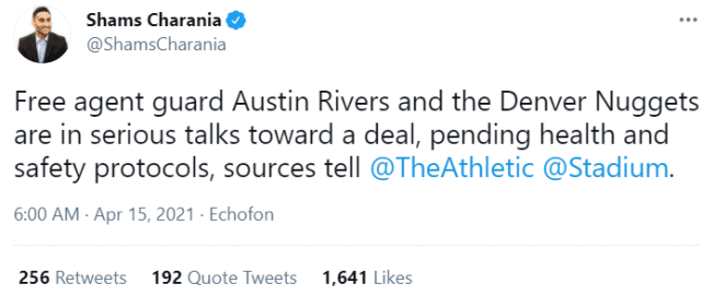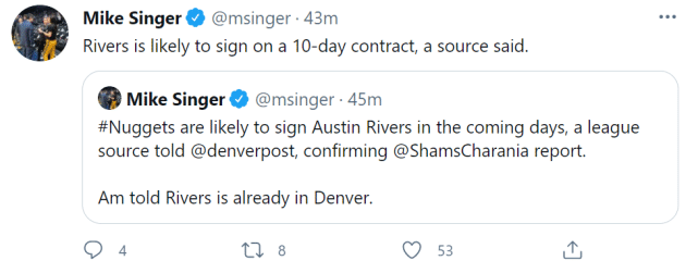 来源:24直播网04-15 16:2424直播网4月15日讯,据名记查拉尼亚报道,自由球员奥斯丁-里弗斯正在和掘金认真商讨签约。掘金记者跟进报道称,他将签下的是一份10天短合同,目前,里弗斯已经抵达丹佛。掘金后卫穆雷在对勇士比赛中遭遇十字韧带撕裂的重伤,赛季报销。掘金需要填补后场的漏洞,他们计划给小里弗斯一个机会。