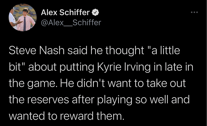 针对最后时刻拒绝上主力球员,纳什在赛后也进行了解释,他表示自己是一度想派上欧文的,但觉得还是要奖励给那些追分的替补球员:“有稍微考虑过(换上欧文),但我不想换下这些打得如此出色的球员,我想奖励这些跟欧文打得同样出色的轮换球员。”