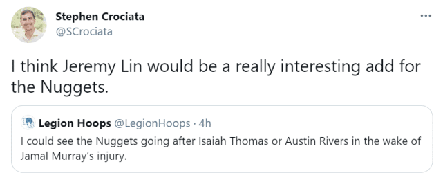 不过,这个赛季NBA的伤病实在太多,客观上也会给林书豪创造一些补位的机会。比如掘金的穆雷遭遇前十字韧带撕裂的重伤,赛季报销,这支西部劲旅需要补强后场。