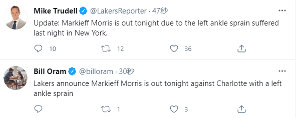 目前湖人队伤病满营,詹姆斯、浓眉两大巨头继续休战,虽然库兹马、庄神将会带伤出战于黄蜂的比赛,但湖人又一主力伤停——大莫里斯因脚踝扭伤缺席比赛;在詹姆斯和浓眉同时缺席期间,大莫里斯四月份场均贡献13.5分5.5篮板,投篮命中率51.5%。