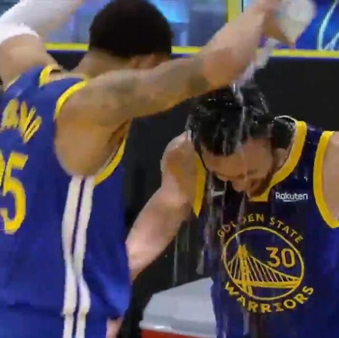 赛后,库里在场边接受采访,队友托斯卡诺-安德森和贝兹莫尔往他身上狂浇水。可以看得出来勇士全队都很兴奋,完全是属于他一个人的夜晚!而且在他的带领下勇士其他人也都发挥了很重要的作用没让掘金翻盘,贝兹莫尔、安德森等人自然要给老大好好庆祝一下!