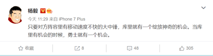 国内的名嘴也都疯狂了,杨毅、王猛等名嘴,也是纷纷发表自己的看法!杨毅表示只要对手没有速度够快的中锋进行换防协防,那么库里就能创造各种神迹的机会,这也很好理解!防库里要么包夹,要么无限换防,没别的办法!朱彦硕则是言简意赅,直接解读两个字“日天”就能解读,只不过他用的是英文爆粗口的模式!