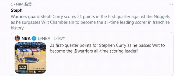 这一切的一切都是库里所应该得到的赞誉!值得一提的是,今日的库里登上了美媒推特热搜榜第一位,就知道所有人都在关注着这场比赛,关注着这个时代伟大球星疯狂的表演!也许还有人拿勇士本赛季的战绩来调侃库里,但没有任何人生涯所处任何阶段都站在顶点的,现在正处于勇士低潮期,但谁又能知道下个赛季会变成什么样呢?