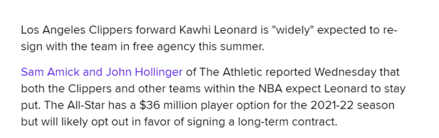 2019年夏天,莱昂纳德和快船签下了一份3年1.03亿美元的合同,2021-22赛季是球员选项,价值3600万美元。去年12月时,小卡本人就提到过跳出最后一年合同应该是最明智的选择。