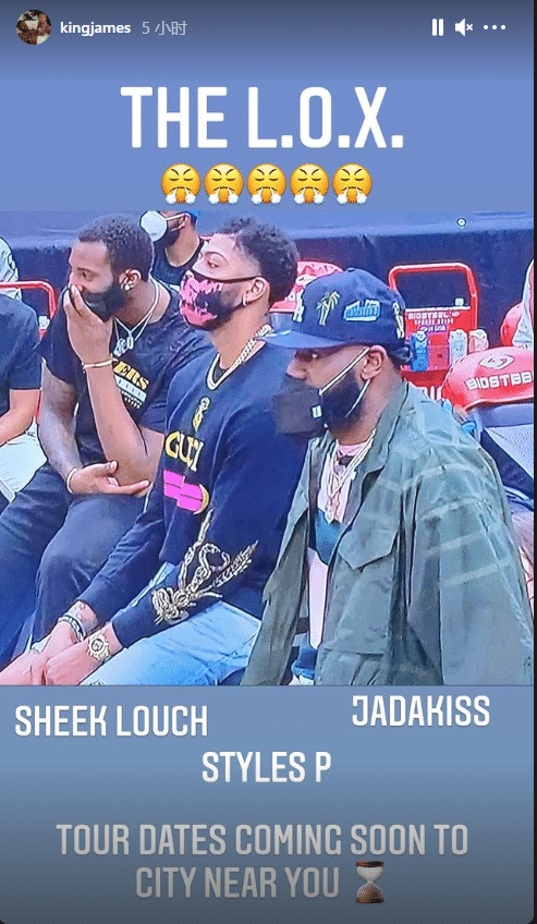 来源:24直播网04-08 15:5824直播网4月8日讯湖人当家球星詹姆斯更新社交媒体,晒出三巨头的同框合影,暗示三人即将重返赛场;在InstagramStory晒照并且写道:L.O.X.说唱组合Sheen Louch、Styles P、Jadakiss(都是说唱歌手的名字),巡演日期临近,前往你周边的城市!