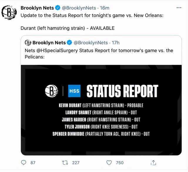 杜兰特此前遭遇类似伤病,本来说好的十天,结果休息了一个多月,而哈登这边十天后进行再次检查,这对于即将开始冲击季后赛的篮网队并不是好消息,要知道季后赛中球员的健康程度是追求冠军的最大保障。