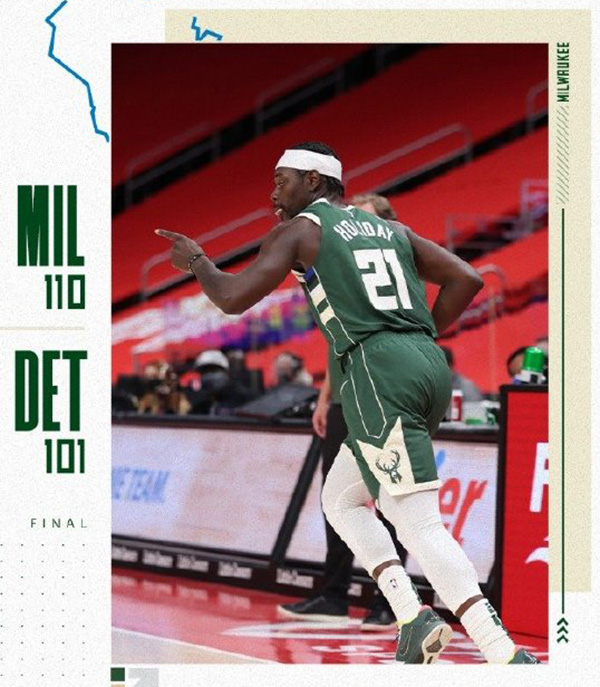 雄鹿110-101轻取活塞 字母哥22+10+10 霍勒迪21+6