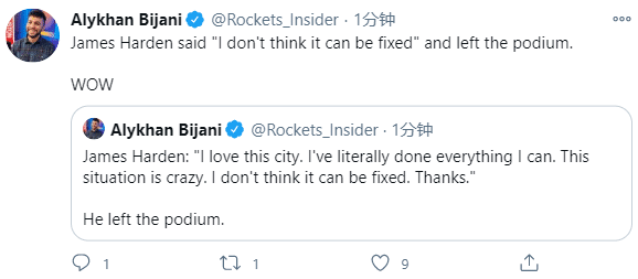 火箭输球赛后,哈登不满球队阵容实力,直言:火箭队还不够出色,我爱这个城市,我已经竭尽全力;这种情况太疯狂了。我认为这种情况是无法解决的,谢谢!