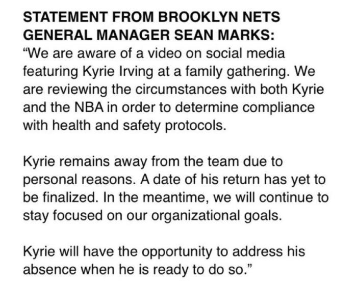 欧文涉嫌违规!联盟正式介入调查,篮网配合调查GM声明回应此事