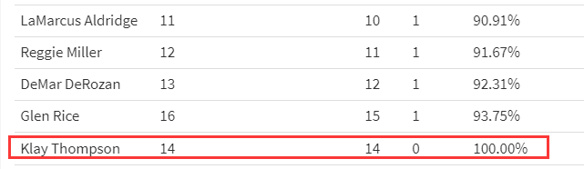 HoopsHype的数据显示,在这100名球员里,只有一个人的40+胜率是100%,他就是勇士球星克莱-汤普森,汤普森生涯一共14场得分40+,勇士全部获胜。