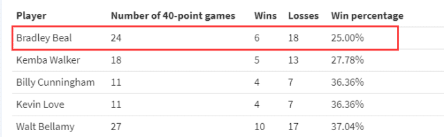 24直播网1月11日讯 轰下40+的分数,球队却赢不了球,这显然是一件令人扎心的事。本赛季至今,奇才球星比尔两次得分突破40分,球队却都输了比赛,把上赛季也算上的话,近两年,比尔有12场比赛得分40+,奇才竟然输了其中11场。近日,美媒HoopsHype公布了一份历史球星40+得分的胜率排行榜,比尔排名倒数第一。