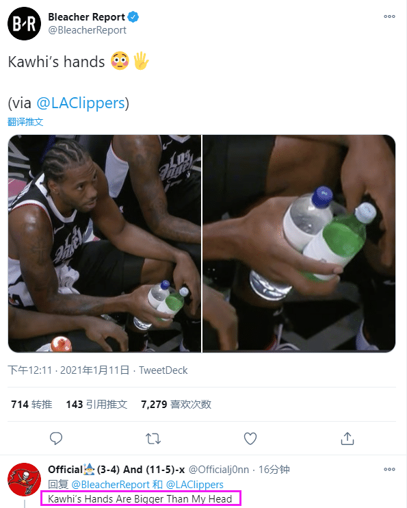 快船官推晒小卡大手照后,《露天看台》、ESPN以及其他美媒都疯狂转发这一画面,有美球迷在评论区留言:小卡的手比我的头还大。