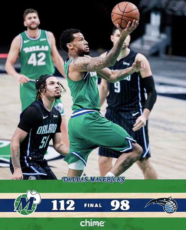 末节,罗斯制造犯规两罚全中,伯克突破博恩上篮命中,两队接近一分钟没得分,约翰逊上篮命中后独行侠拉开到12分,戈登持球突破制造犯规两罚一中,伯克三分命中,白魔兽三分回应,东契奇再助攻伯克三分命中(独行侠95-81领先),暂停后小哈达威登场制造罗斯犯规两罚全中,东契奇三次三分不中魔术将分差缩小到9分,考利斯坦与东契奇制造犯规四罚全中比赛走向完结。最终独行侠112-98以击败魔术。