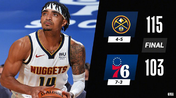 末节,手握21分领先分差的丹佛掘金悉数换下主力阵容,但只有7人出战的76人只能继续派遣主力上场。尽管如此,费城一直没有办法缩小分差,掘金的新秀RJ-汉普顿也得到出场机会。在比赛还剩最后2分06秒时,迈克-马龙教练让板凳席上的其他球员也得到上场时间,至此,掘金全队15人全部出场。比赛结束时,掘金以115-103轻取76人,送给对手两连败。