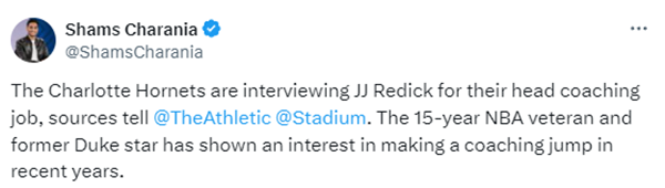 23-24赛季,黄蜂常规赛战绩为21胜61负,赛季结束后,黄蜂主帅克利福德辞去了主帅职务晋升为球队管理层顾问。据此前报道,黄蜂新帅的候选人包括:国王助教乔迪-费尔南德斯、凯尔特人助教查尔斯-李、热火助教克里斯-奎因、太阳助教凯文-杨;现在前NBA射手雷迪克也面试黄蜂主帅一职。