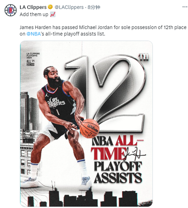 快船官方第一时间晒海报祝贺哈登超越乔丹。
