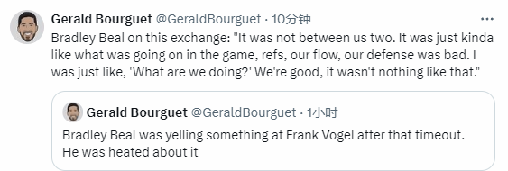 据太阳记者报道,第四节暂停时比尔和沃格尔发生争吵,赛后比尔澄清:我们并没有吵架,我们就是在讨论比赛的走向、裁判的判罚等话题;比尔还表示:我们之间很好。