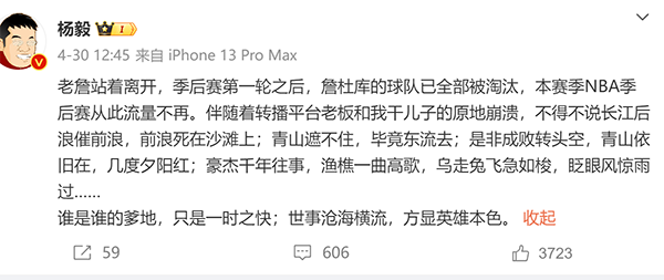 老牌巨星的过早出局,对于NBA的收视率和流量都有很大的影响,此前杨毅就看衰,称“本赛季NBA季后赛从此流量不再”,他的意思就是这些巨星有很多球迷和拥趸,他们过早被淘汰,对于NBA都有很大的冲击。