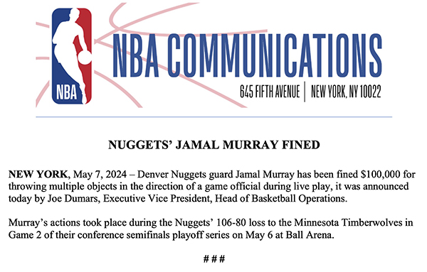 NBA官宣!穆雷因扔物被罚10万美元,禁赛豁免