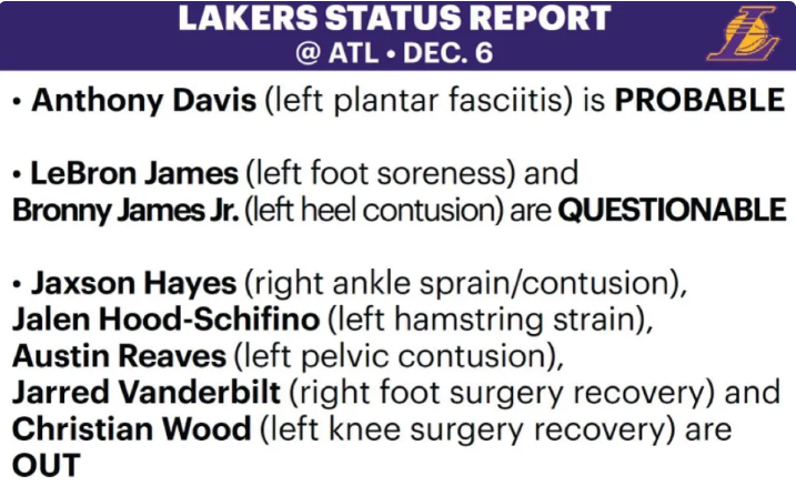 詹姆斯一直公开表示他要打满82场比赛,可赛程密集以及他就要40岁了,事实证明他确实该休息一下;下一场对阵老鹰,詹姆斯(左脚酸痛)出战成疑,布朗尼(左脚跟挫伤)也出战成疑;浓眉大概率出战,海斯、席菲诺、里夫斯、范德比尔特和伍德都因伤继续缺战。