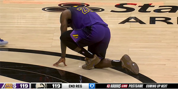 末节湖人和老鹰打得仍旧难分难解,关键时刻詹姆斯挺身而出,12.9秒送出绝平上篮,克里斯蒂盖帽拒绝绝杀,第四节詹姆斯一人独砍14分,比赛打进加时赛;最后时刻,詹姆斯与浓眉相撞,痛苦跪地并且一瘸一拐十分痛苦。