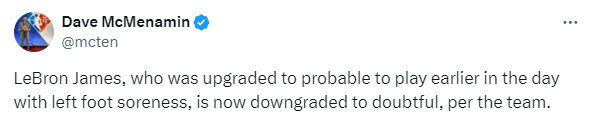 昨天湖人官方宣布詹姆斯左脚酸痛被列为出战成疑,今日赛前,詹姆斯的状态先是升级到大概率出战,可之后他的比赛状态降级为小概率出战(25%出战可能),也就是大概率因伤休战;换言之,詹姆斯大概率首次因伤休战,这意味着他想要打满82场的目标要破灭了。