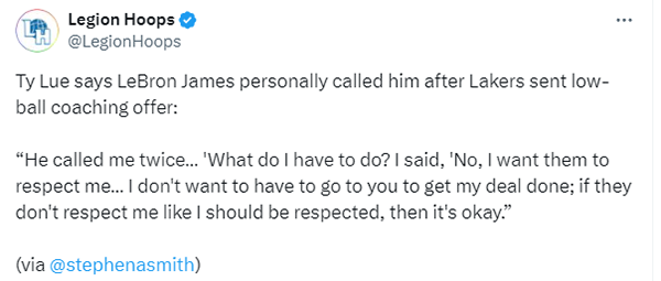 究竟泰伦-卢和湖人执教发生了什么?据泰伦-卢本人透露,他说:我是总冠军教练,在其他人都得到五年合同和更多钱的情况下,他们只愿意给我三年合同,然后他们还想挑选我的教练团队,这对我来说是简直就是被打脸的耻辱。你知道我是个忠诚的人,我无法把我的团队留在克利夫兰,让他们没有工作,所以我无法接受这份工作。