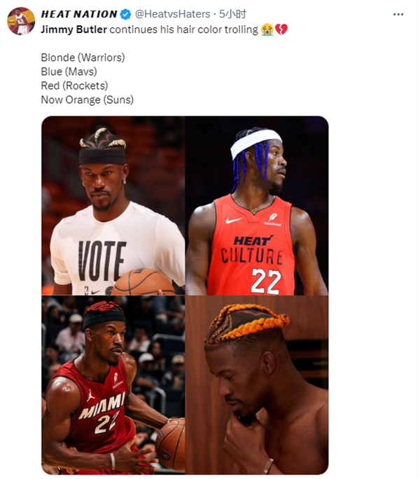 今日赛前,巴特勒的橙黄色新发型引热议,美媒调侃这证实了巴特勒想要加盟太阳。