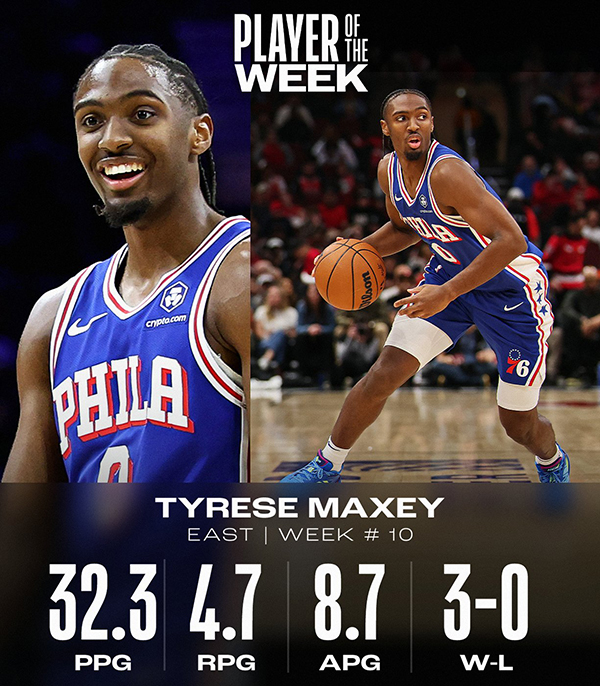 上周马克西带领76人拿到3胜0负的战绩,马克西场均拿到32.3分4.7篮板8.7助攻——对阵马刺拿到32分10篮板8助攻,对阵凯尔特人拿到33分12助攻4篮板,对阵爵士拿到32分6助攻,马克西连续三场30+带队喜提三连胜。
