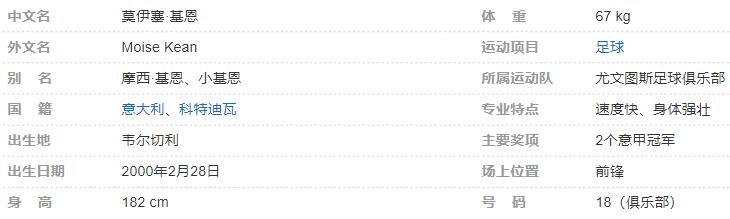 莫伊塞·基恩(Moise Kean),2000年2月28日出生于意大利韦尔切利,意大利足球运动员,司职前锋,现效力于意甲尤文图斯足球俱乐部。