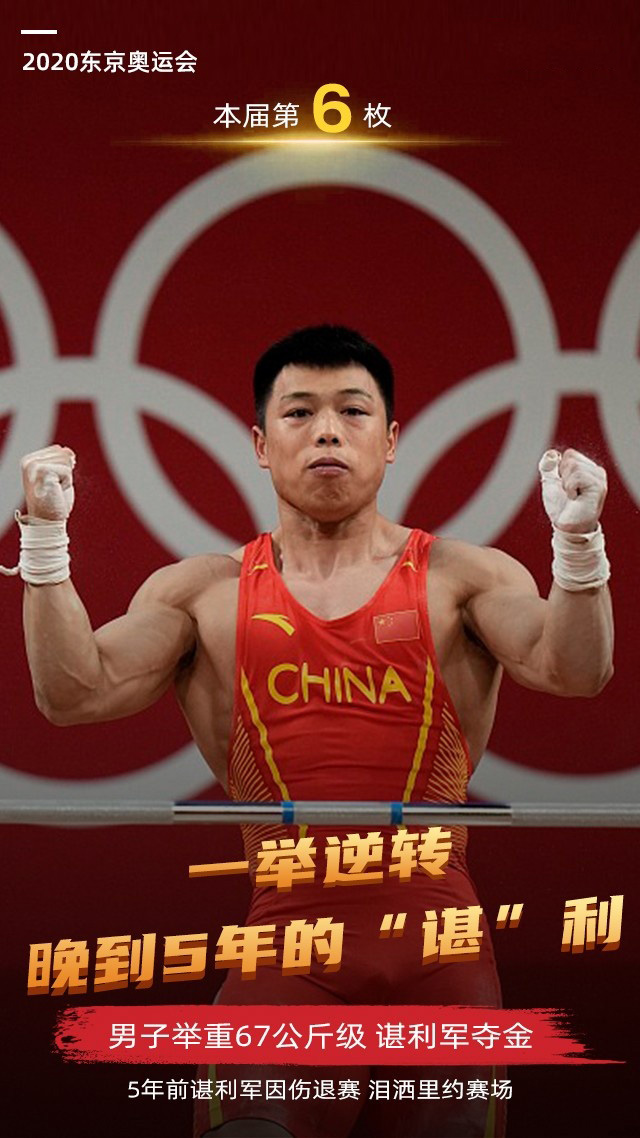 - 【集锦】[颁奖仪式] 中国军团第6金!男子67公斤级举重 谌利军夺得金牌2021-07-26 09:05:35
