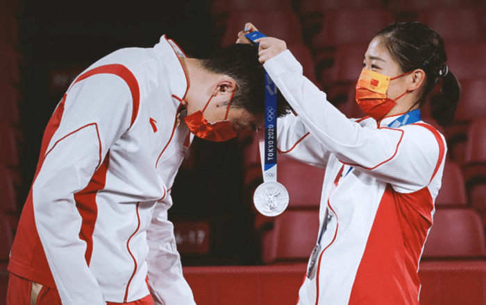 赛后的颁奖仪式上,由于本届奥运会需要自己颁奖,因此许昕和刘诗雯效仿了很多双打组合的颁奖方式,给对方挂上了这枚奖牌。先是许昕给刘诗雯挂,随后刘诗雯给许昕挂。虽然成色不是金色,但在给对方挂奖牌的过程中,隔着口罩,依然可以看到两人的笑容。