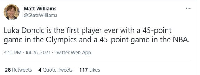 StatMuse还通过和美国男篮的首秀对比,看看东契奇有多么可怕。“杜兰特、利拉德、拉文和霍乐迪在首战一共得到47分,而东契奇一人得分就达到48分,比他们的总和还高。”