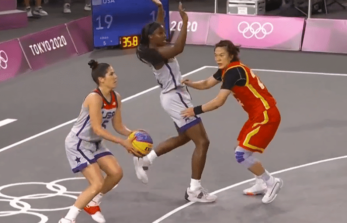 普拉姆中投命中,两队比分来到了13:13平,张芷婷内线再中,杨突破上篮命中,两队比分交替领先,普拉姆反跑上篮命中,王丽丽远投回应,道尔森连续拿到2分,格雷拉开单突万济圆得到1分,万济圆篮下强打回敬,普拉姆远投命中,全场比赛结束美国三人篮球队21-19中国三人篮球队。杨舒予8分、王丽丽6分、张芷婷3分、万济圆2分,虽然输球了,但是中国队的表现非常不错,本届赛事,中国队有很大的机会去冲击奖牌。