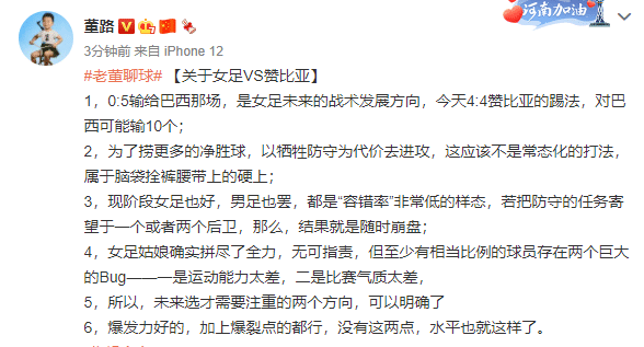比赛结束,知名足球人董路也在社交媒体上对于这场中国女足4-4战平赞比亚给出了自己的看法, 进行解读: