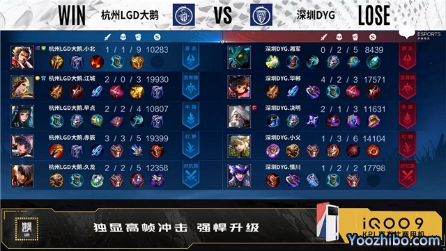 双方常规开局。1分02秒杭州LGD大鹅中路击杀牛魔拿到一血。2分34秒暴君处团战双方1换1。3分05秒深圳DYG中路上河道击杀镜。4分25秒深圳DYG中路击杀镜。5分06秒杭州LGD大鹅发育路击杀黄忠。5分48秒深圳DYG中路下河道击杀王昭君。6分14秒野区团战双方1换1。6分58秒深圳DYG抢到暴君。10分31秒深圳DYG拿下暗影主宰。10分44秒深圳DYG中路击杀盾山。11分20秒深圳DYG摧毁敌方中路外塔。12分58秒发育路团战深圳DYG击杀盾山。14分12秒中路团战深圳DYG打出1换2。14分34秒深圳DYG拿下暗影主宰。16分22秒暴君处团战深圳DYG打出1换3。17分01秒深圳DYG摧毁敌方发育路、中路高地塔。18分23秒深圳DYG拿下暗影主宰。19分25秒深圳DYG摧毁敌方水晶拿下比赛。
