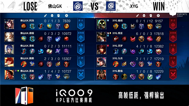 双方常规开局。1分06秒佛山GK狄仁杰发育路击杀公孙离拿到一血。3分34秒佛山GK发育路击杀公孙离。4分06秒佛山GK摧毁敌方中路外塔。5分43秒佛山GK摧毁敌方发育路外塔。5分59秒佛山GK发育路击杀橘右京。6分18秒佛山GK摧毁敌方发育路二塔。7分48秒佛山GK摧毁敌方中路二塔。8分28秒佛山GK摧毁敌方对抗路二塔。8分40秒佛山GK拿下主宰。9分03秒XYG拿下暴君。10分17秒佛山GK拿下暗影主宰。11分36秒高地团战双方1换1,佛山GK摧毁敌方中、对抗路高地塔。12分54秒佛山GK拿下暗影暴君。14分02秒佛山GK摧毁敌方水晶拿下比赛。
