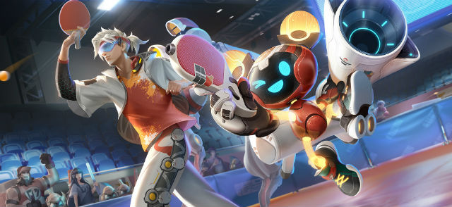 鲁班七号发射出一枚进行了乒乓球拍涂装的特别火箭炮,火箭炮飞出的过程中,伴随有赛场获胜庆祝彩带的粒子效果。