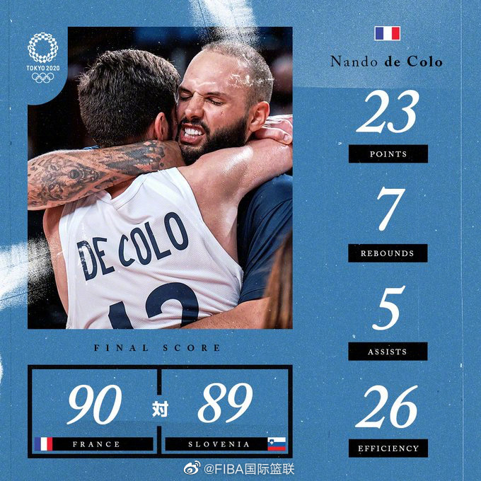 24直播网8月5日讯 东京奥运会男篮半决赛,斯洛文尼亚对阵法国,此前由东契奇领衔的斯洛文尼亚小组赛三连胜,四分之一决赛轻取德国,实力不容小觑;而法国也是小组赛力克美国三连胜,四分之一决赛力克意大利,两队强强对话定会十分精彩。首节斯洛文尼亚率先进入进攻状态,东契奇得分和助攻两手抓帮助斯洛文尼亚一直压制着法国,但鲁瓦乌上场后里突外投帮助法国追至2分,次节双方命中率都有下降,但比分十分胶着,佩比历成为斯洛文尼亚的奇兵,半场结束还领先2分。易边再战,法国队依靠外线打出进攻波将分差直接反超,东契奇进攻端带领斯洛文尼亚追分,随后德科洛成为关键人物,里突外投帮助法国守住6分的优势,末节斯洛文尼亚上来就咬住比分并一度追平,东契奇和托比的挡拆法国队始终解决不了,但富尼耶和德科洛两个后场连续顶住压力帮助法国队掌握住领先优势,最后时刻佩比历接东契奇传球绝杀上篮被巴图姆追帽,最终法国男篮险胜斯洛文尼亚男篮,进入决赛再次对阵小组赛对手美国队。
