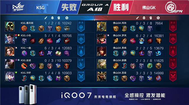开局59秒佛山GK反掉敌方蓝BUFF。4分39秒KSG中路击杀大乔拿到一血,KSG后续追击打出1换3。6分04秒KSG下路击杀虞姬。8分25秒佛山GK上路击杀橘右京。9分07秒佛山GK摧毁敌方下路外塔。10分30秒中路团战KSG击杀虞姬。10分54秒KSG拿下暗影暴君。12分03秒KSG下路打出0换3。12分49秒KSG拿下暗影主宰。15分09秒KSG拿下暗影暴君。16分33秒上路团战KSG打出1换3。16分53秒KSG摧毁敌方中路高地塔。17分02秒KSG摧毁敌方水晶拿下比赛。