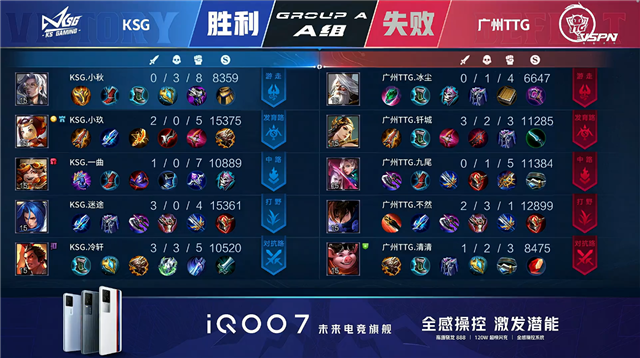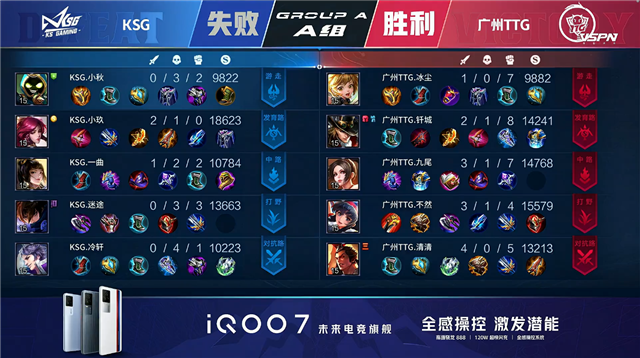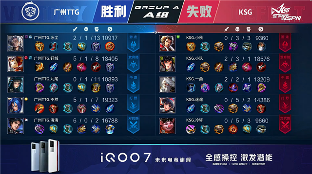 开局广州TTG反掉一组野怪。2分13秒广州TTG中路击杀太乙真人拿到一血。4分15秒广州TTG野区打出0换2。4分48秒广州TTG拿下暴君。5分52秒KSG摧毁敌方下路外塔,KSG上路击杀澜。7分47秒广州TTG摧毁敌方中路外塔。8分27秒广州TTG摧毁敌方上路二塔。8分59秒广州TTG摧毁敌方中路二塔。9分08秒广州TTG摧毁敌方下路二塔并拿下暴君。9分29秒广州TTG下路击杀太乙真人。10分14秒广州TTG拿下暗影暴君。11分25秒广州TTG摧毁敌方上路高地塔。12分20秒广州TTG下路击杀刘邦。12分59秒广州TTG摧毁敌方中路高地塔,KSG击杀不知火舞。13分46秒双方上路1换1。14分40秒广州TTG中路下河道击杀刘邦。14分53秒广州TTG拿下暗影暴君。15分27秒广州TTG摧毁敌方下路高地塔。16分26秒广州TTG拿下暗影主宰。16分47秒中路提下河道团战KSG击杀马可波罗。20分50秒广州TTG野区打出0换5,吕布拿到三连决胜。21分14秒广州TTG摧毁敌方水晶拿下比赛。