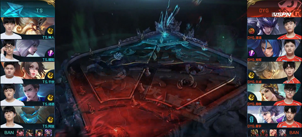 第四局:TS背水一战,千世选出他世冠至今百分百胜率的不知火舞,DYG则帮助清清拿到马超。比赛前中期,DYG凭借马超的单线优势以及游走取得优势;比赛第12分钟,阿豆关键开团背回易峥,TS找回场上主动权;最后一波团战,神人老夫子灵性蹲草丛绑住刘邦,TS集火完成秒杀,随后拿下暴君,借助兵线强行一波结束比赛,扳回一局。第五局比赛,TS帮助诗酒拿下百里守约,三无尽百里创始人在绝境中选出了自己的招牌。进入比赛后,尽管诗酒前期命中率一般,但TS依旧建立起经济优势;比赛中期,诗酒逐渐找到手感,连续狙中引得赛场阵阵欢呼,虽然DYG一度凭借久诚一波天秀秒杀百里的操作扳回一些局面,但在后期,他们仍然对诗酒的百里守约毫无办法,最终在百里的火力压制之下,TS再次扳回一局。