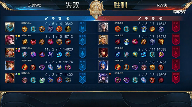 开局RW侠入侵野区未果,团战东莞Wz打出1换2。1分58秒东莞Wz反掉敌方红BUFF。2分22秒东莞Wz拿下主宰。2分55秒RW侠拿下暴君。3分14秒东莞Wz下路击杀橘右京。3分20秒东莞Wz中路击杀周瑜。4分38秒东莞Wz下路击杀周瑜。5分09秒东莞Wz摧毁敌方下路外塔。6分17秒RW侠野区击杀云缨。6分56秒RW侠拿下主宰。7分36秒RW侠野区击杀盾山。8分15秒东莞Wz野区击杀橘右京。8分24秒野区团战东莞Wz打出0换2。8分47秒东莞Wz摧毁敌方中路外塔。9分15秒中路团战东莞Wz击杀鲁班大师。9分36秒东莞Wz拿下暴君。10分50秒东莞Wz拿下暗影暴君,RW侠拿下暗影主宰,野区团战东莞Wz击杀周瑜。11分54秒东莞Wz摧毁敌方上路外塔。12分07秒上路团战东莞Wz击杀鲁班大师。13分22秒东莞Wz野区击杀马超。13分59秒东莞Wz摧毁敌方下路二塔。14分26秒上路团战东莞Wz打出1换2。14分54秒东莞Wz摧毁敌方中路二塔。16分26秒东莞Wz野区击杀马超。17分53秒东莞Wz上路打出0换2。18分29秒东莞Wz摧毁敌方下路高地塔。18分51秒东莞Wz野区击杀橘右京。19分07秒东莞Wz野区击杀马超。20分03秒下路团战RW侠打出1换2。21分20秒东莞Wz拿下风暴龙王,RW侠击杀盾山。22分02秒RW侠摧毁敌方中路外塔。22分56秒东莞Wz摧毁敌方中路高地塔。23分14秒高地团战双方2换2,RW侠三高被破。24分38秒野区团战RW侠打出1换5。25分27秒RW侠摧毁敌方水晶拿下比赛。