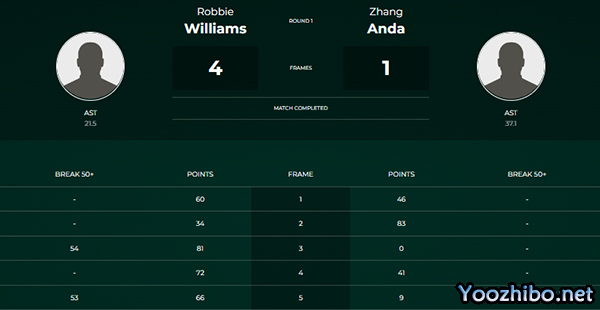 24直播网讯 北京时间10月26日,2023斯诺克北爱尔兰公开赛第3轮中,罗比-威廉姆斯对阵张安达,罗比-威廉姆斯凭借单杆打出54分和53分,总比分4-1击败张安达,晋级下轮。