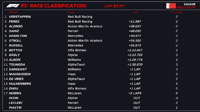 2023年F1巴林大奖赛正式比赛成绩表: