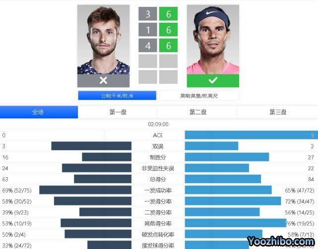 首盘比赛纳达尔在第2局完成破发,开局取得3-0的领先。第9局纳达尔迎来发球胜盘局,他顺利保发成功,6-3拿下了首盘比赛。第二盘纳达尔在第1局和第3局两度破发成功,开局取得4-0的领先优势。第7局纳达尔在对手发球局再度破发,6-1轻松赢下第二盘。